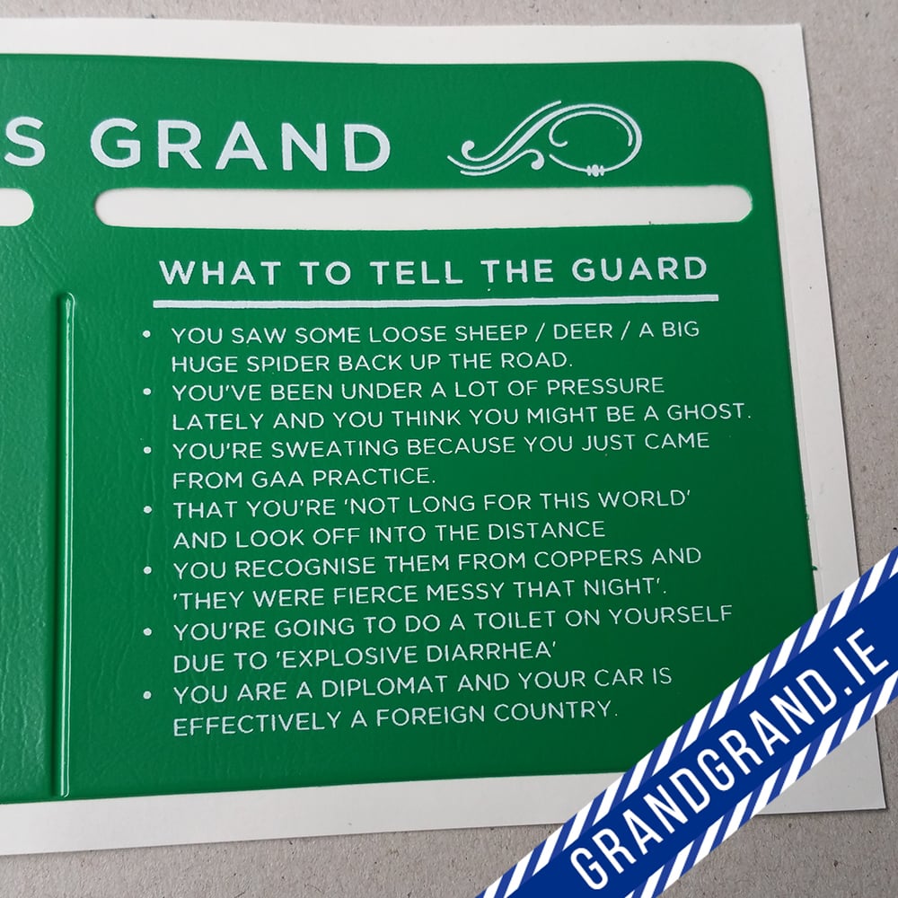 This oft overlooked piece of equipment has cried out for a redesign perhaps since the dawn of motoring. Sceptics will point to the 'Keep Going Sure It's Grand' slogan and label this a callow branding of a standard Tax/Insurance/NCT disc holder but no, this device has so much more to offer. Not only is it lovingly crafted from 100% genuine pleather in a shade of patriotic Kelly Green but on the outside or 'Guard side', lies the complimentary phrase 'You're looking well guard'.